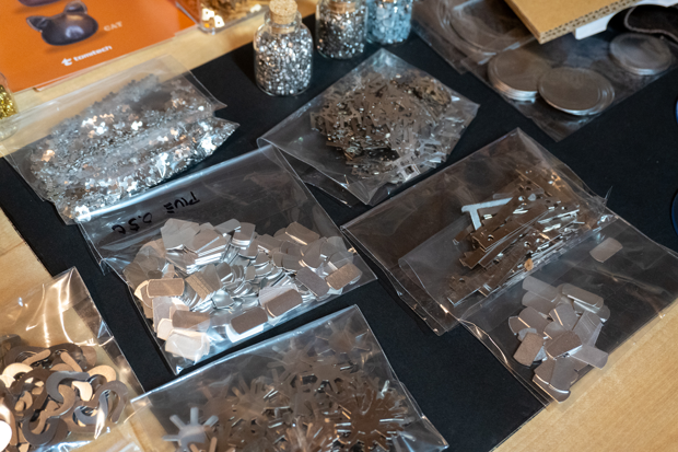 これは、金属加工品の端材。小さな穴の開いた部品をつくるためにプレス機械によってくり抜かれた部分だ。ビンに入っていると星の砂のようできれいだが、くり抜かれた直後は油まみれでバリがある状態なのだそう。繰り返し洗浄して油を取り、バリを取る作業をしてようやくこの形になる。だから、出た端材を全部チョコ・ザイにすることはできない。工場の従業員の方が本業の合間に作業できる範囲内で「ちょこっと」つくるのだ。