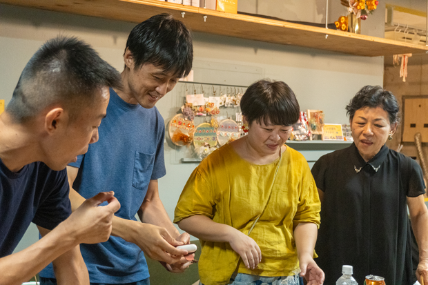 それに対し、ハンドメイド作家は、帽子、革靴、刺繍、アクセサリー、金属工芸、置物など、多方面のジャンルで扱う素材もさまざま。それぞれが興味のあるチョコ・ザイを手に取りながら、何を製造する過程で生まれ、どのような「少しの加工」が施されたものなのか、未来DESIGNのメンバーの説明を真剣な眼差しで聞き入っていた。