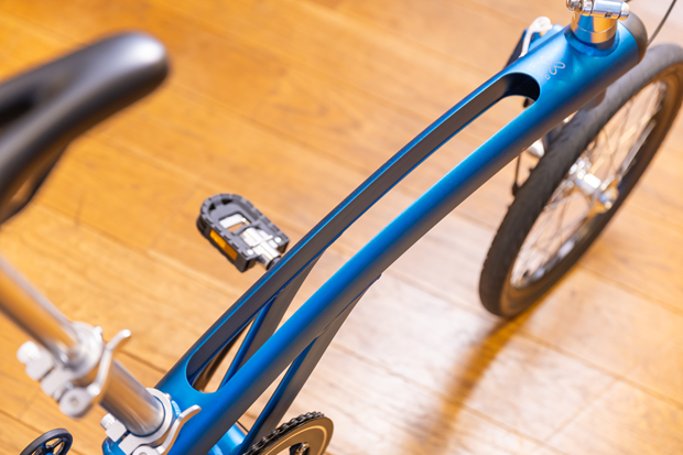 折りたたみ自転車はたたみ方の機構にそれぞれ特徴があるが、irukaは折りたたんだ際の車輪の収め方に一番の特徴がある。「ジャックナイフフレーム」と名付けられたトップチューブのスリットに、折りたたんで前に持ってきた後輪を格納するのだ。