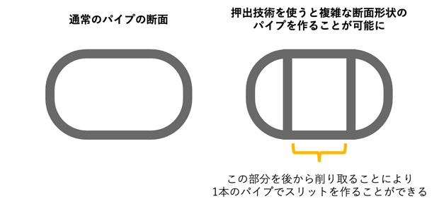 通常、パイプと聞くと1枚の板が続いている下図(左)のような断面のものを想像するだろう。アルミ押出技術を使うと、下図(右)のように中に仕切りが入った状態の1本のパイプを作ることが可能になる。この仕切りに挟まれた部分を削れば、車輪を収めるための穴ができるわけだ。このアイデアと技術によって、irukaの軽くて強いフレームが実現した。