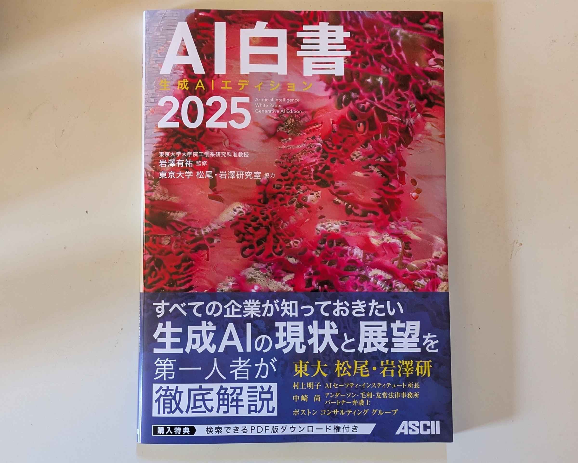 『AI白書2025 生成AIエディション』が届いたMarch 1, 2025少しだけ手伝わせていただいた『AI白書2025 生成AIエディション』が届いた。普段の仕事のほとんどはWebだけど、たまに紙の仕事するとこの瞬間はちょっと嬉しい。「AI白書 2025 生成AIエディション」岩澤有祐 [ビジネス書] - KADOKAWA